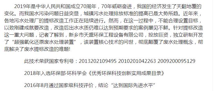 中國高新技術(shù)網(wǎng)發(fā)布:《關(guān)注:解碼科技創(chuàng)新》——新鄉(xiāng)市天盛環(huán)?!俺瑥娧趸€原廢水處理技術(shù)”